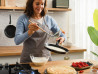 Kjo enë gatimi është gjithashtu e përkryer për pjatat që ngjiten më shumë, si vezët, peshku dhe mishi – falë veshjes cilësore, ato thjesht do të rrëshqasin jashtë. Kjo do të thotë gjithashtu se nuk ka nevojë për sasi të mëdha vaji për gatim - mjafton vetëm një pikë. Ju gjithashtu do të kurseni në vaj dhe do të shijoni ushqime më të lehta dhe më të shëndetshme.
