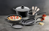 Delimano prezanton Stone Legend Black All-in-One, setin e plotë prej 10 copësh që kombinon dizajn elegant, cilësi të lartë dhe funksionalitet maksimal. Me bazë të fortë çeliku karboni dhe shtresë Quantanium® me grimca të vërteta guri dhe titaniumi, këto enë ruajnë nxehtësinë dhe e shpërndajnë gradualisht te ushqimi, duke mbajtur lagështinë, vitaminat dhe aromën natyrale.